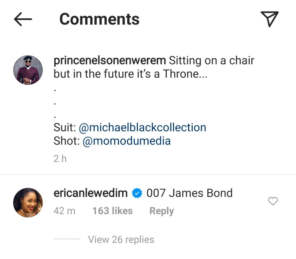 The BBNaija star always blows the minds of his fans with his classic looks in his photos. Reacting to this photo, Erica took to the comment section and wrote, “007 James Bond”.