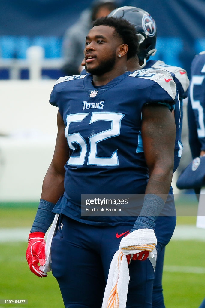 NASHVILLE, TENNESSEE – DECEMBER 20: Aaron Brewer #62 of the Tennessee Titans watches from the sideline during a game against the Detroit Lions at Nissan Stadium on December 20, 2020 in Nashville, Tennessee. (Photo by Frederick Breedon/Getty Images)