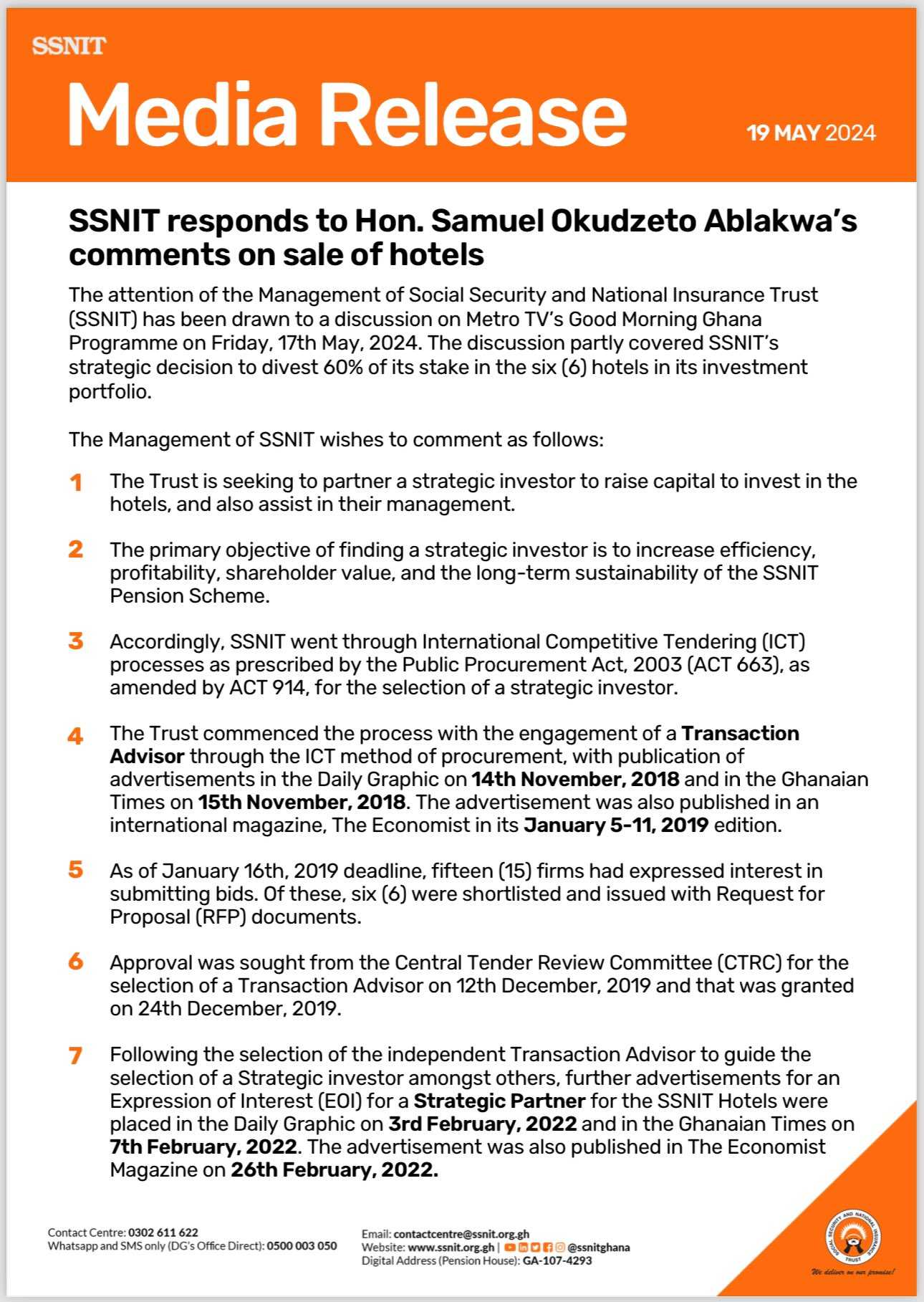 Additionally, Mr. Ablakwa claimed in his petition that he has obtained documents indicating that negotiations for selling a 60% share of six SSNIT-owned hotels to Rock City Hotel Limited, owned by Hon. Bryan Acheampong, are nearly complete.