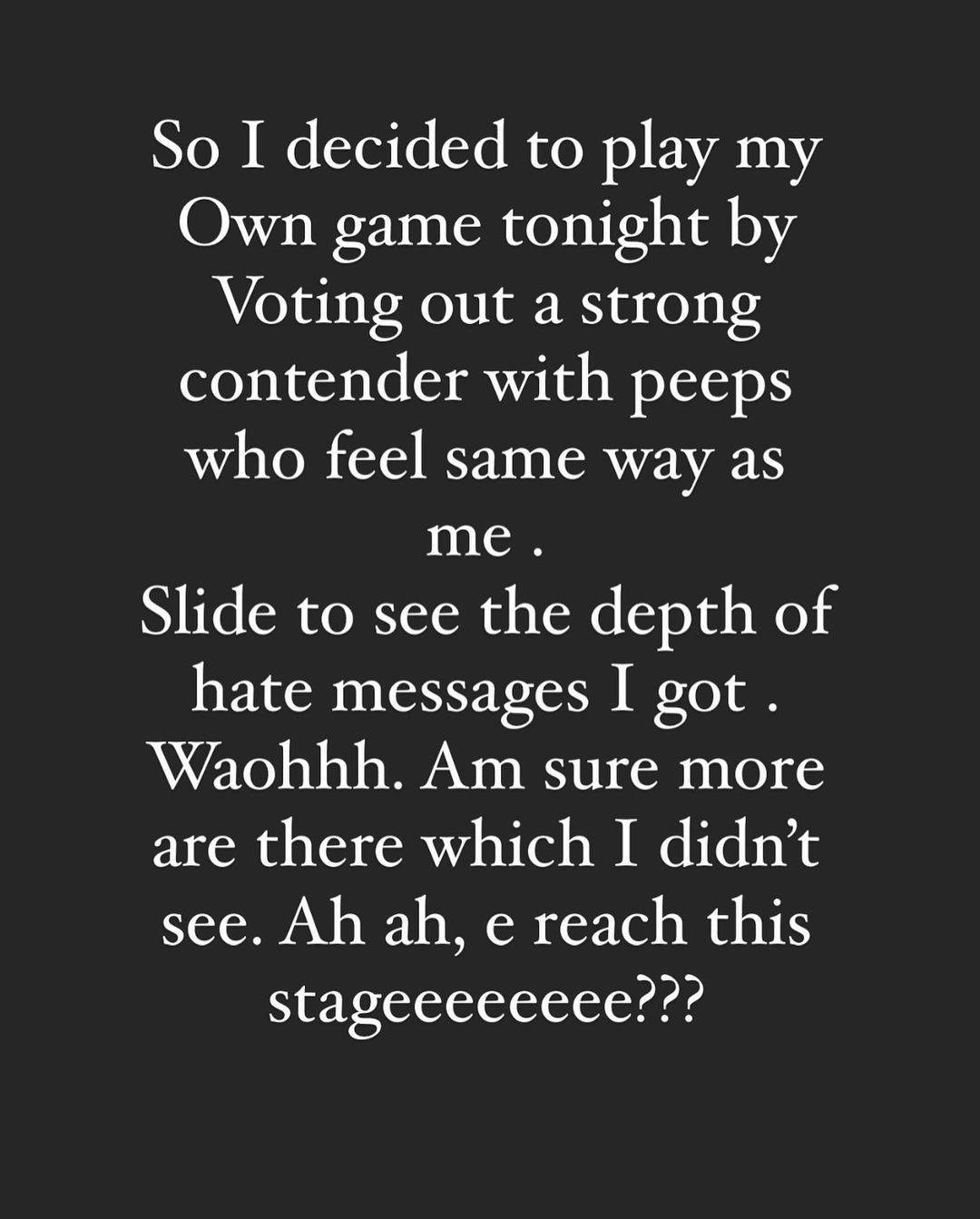 “So I decided to play my Own game tonight by Voting out a strong contender with peeps who feel the same way as me. Slide to see the depth of hate messages I got. Waohhh. Am sure more are there which I didn’t see. Ah ah, e reach this stageeeeeeee???”.