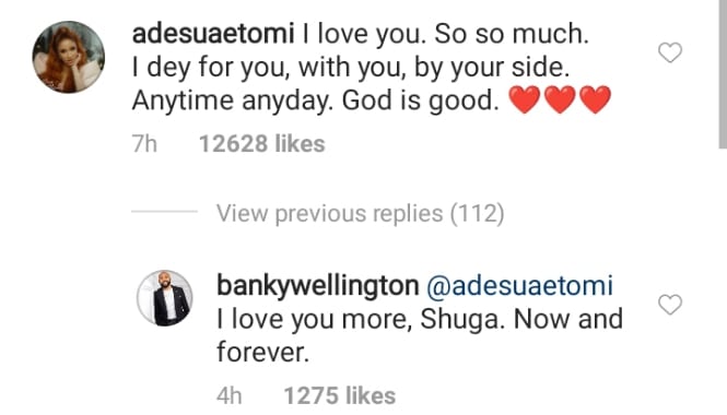 Banky W responded, “@adesuaetomi I love you more, Shuga. Now and forever.”