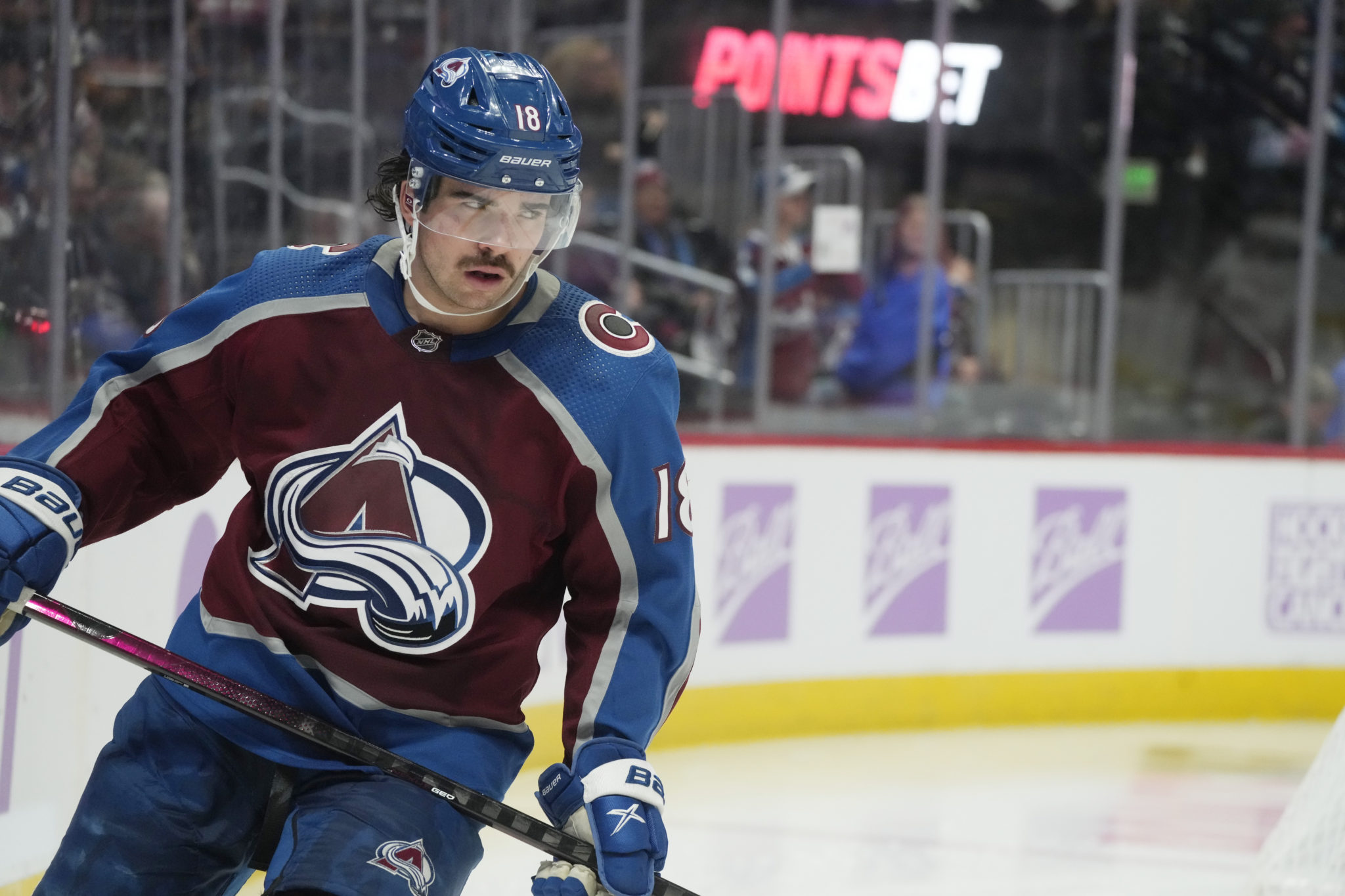 Colorado Avalanche center Alex Newhook (18) in the second period of an NHL hockey game Saturday, Nov. 12, 2022, in Denver. (AP Photo/David Zalubowski)