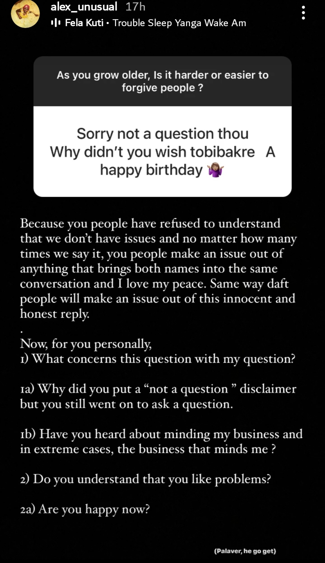 Alex took to her Instagram story to ask her fans a question about forgiveness but a fan decided to ask his/her own question, quizzing her the reason she did not wish Tobi a happy birthday.