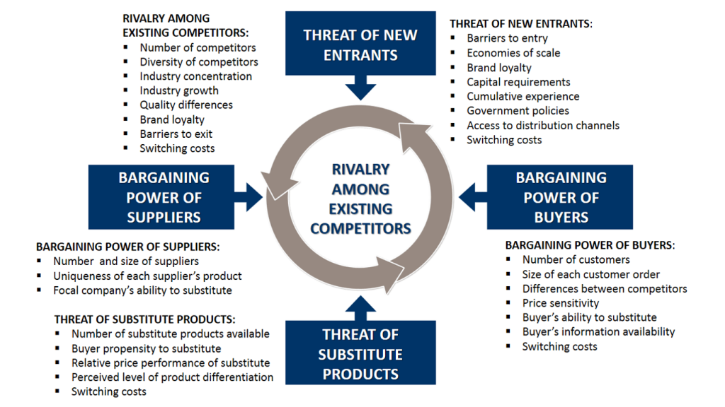These five forces as listed by Michael Porter in 1979 are the power of suppliers, availability of substitutes, the threat of new entrants to the market, competitive rivalry and availability of substitutes.
