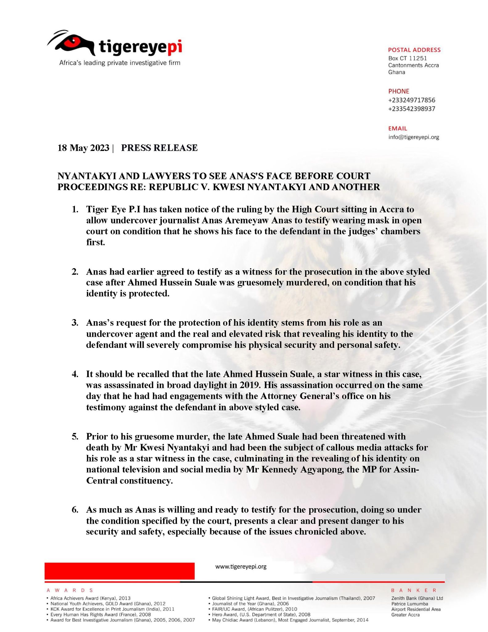 “Anas’s request for the protection of his identity stems from his role as an undercover agent and the real and elevated risk that revealing his identity to the accused person will severely compromise his physical security and personal safety,” a May 18 press release by Tiger Eye PI indicated.