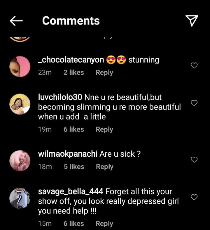 Reacting to the photo, a fan identified as Savage Bella took to the comment section and wrote, “Forget all this your show off, you look really depressed girl you need help”.