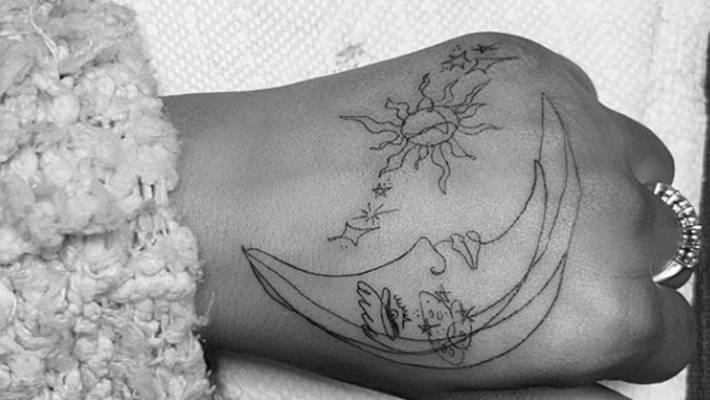 This moon and stars sketch on Grande’s left hand was another addition to her tattoo