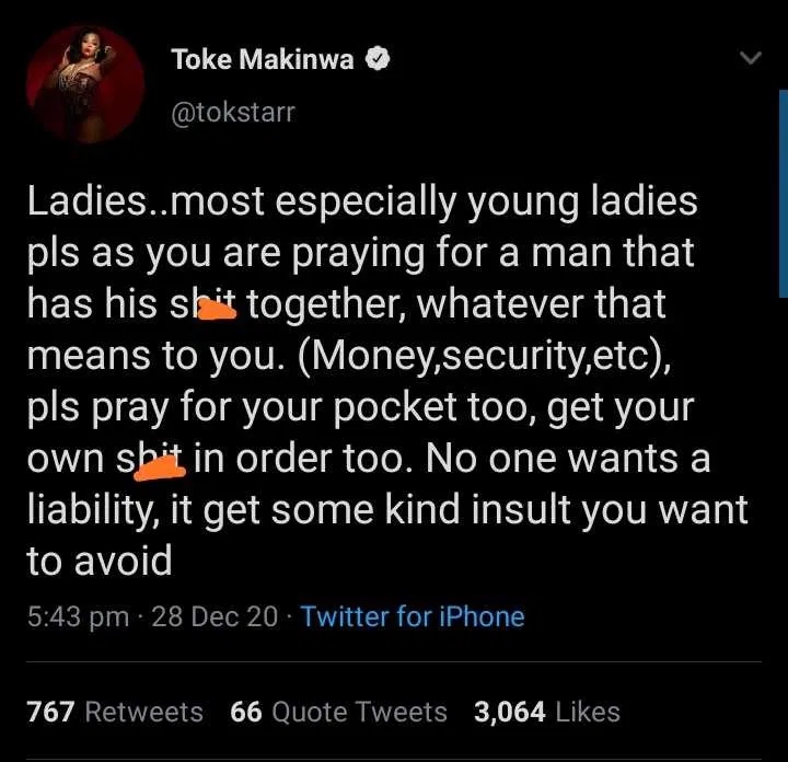 “As You Pray For A Man, Pray For Your Pocket Too” – Toke Makinwa Urges Ladies