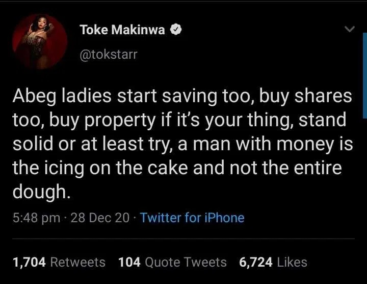 Toke Makinwa has sent out an advisory message to her followers who are looking out for wealthy men.