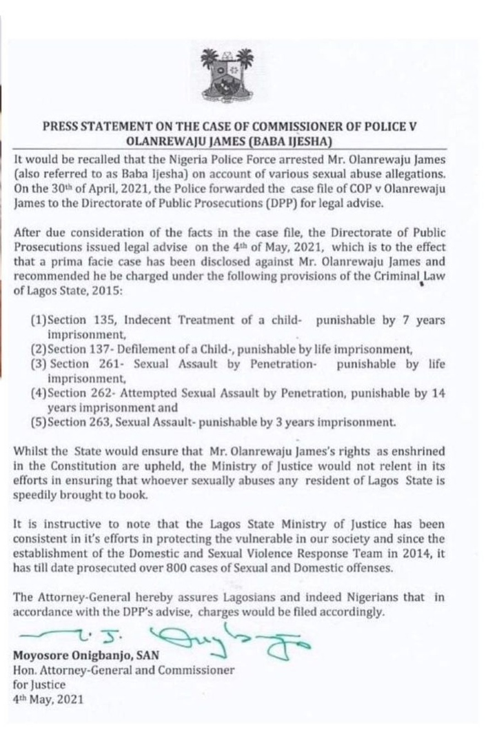 It said after consideration, the DDP issued a legal on Tuesday that a prima face case is disclosed against Baba Ijesha and recommended he be charged under the Criminal Law of Lagos State.