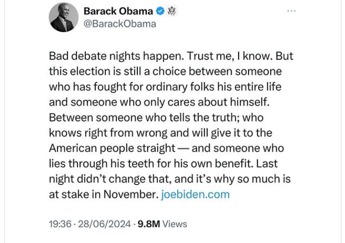 In a reaction that has garnered significant attention, Obama acknowledged Biden’s lackluster performance but urged voters to continue supporting him over Trump. “Bad debate nights happen,” Obama, 62, posted on X, formerly known as Twitter. “Trust me, I know.”