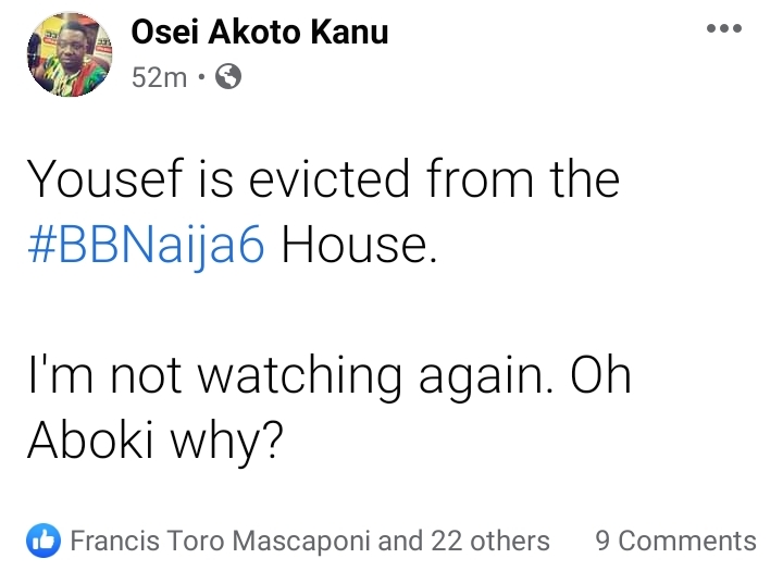 “Yousef is evicted from the #BBNaija6 house. I’m not watching again. Oh Aboki why?”, Osei wrote on his Facebook wall.