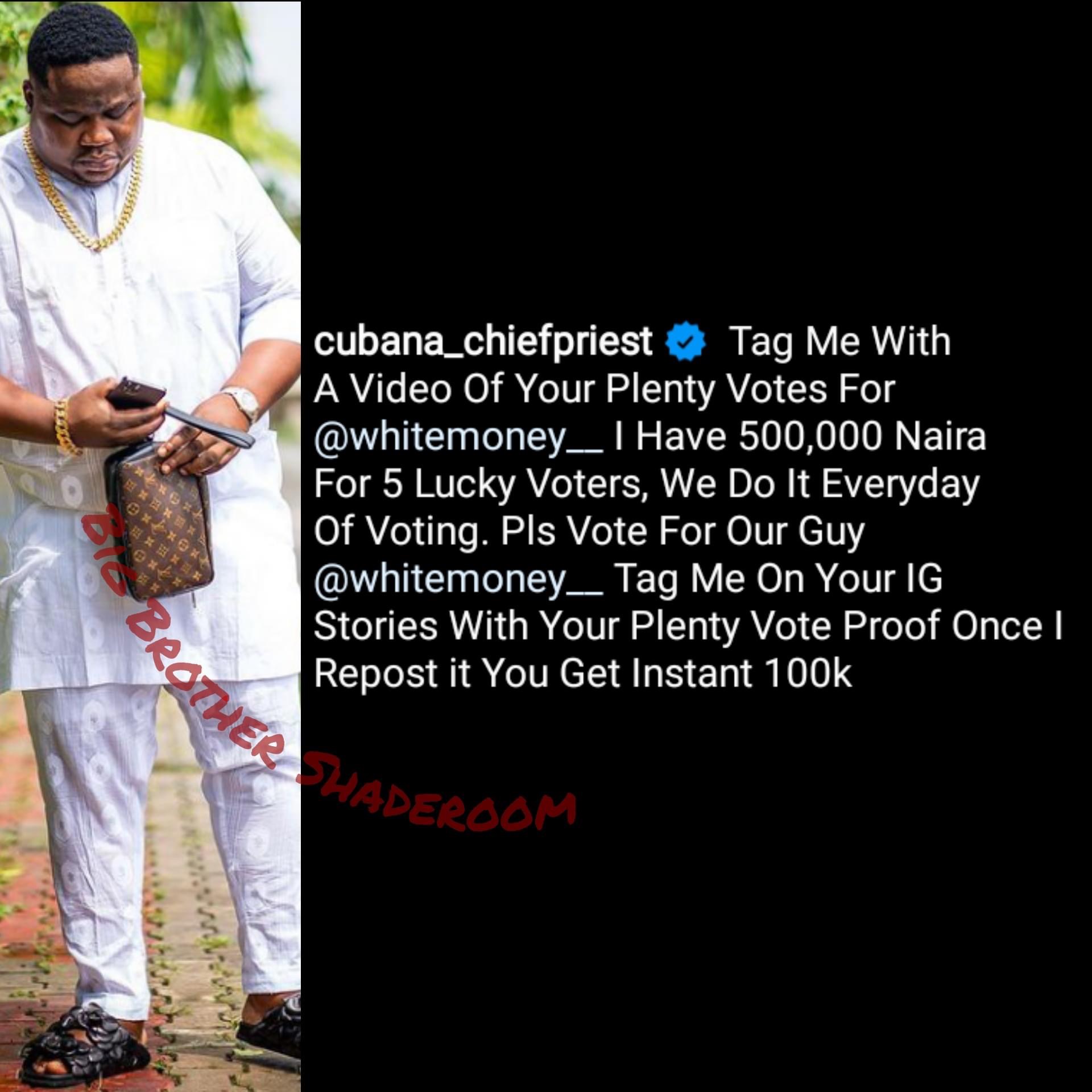 According to Cubana Chief Priest, Whitemoney loyal voters should send him a video of the number of votes they have cast. He said the first top-five among the list will go home or be rewarded with 500k naira. Cubana Chief Priest added that he is doing that every day for more votes for Whitemoney.