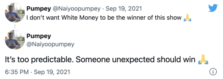 Meanwhile, a man identified as Pumpey seems to have a different notion about the possibility of Whitemoney winning the season 6 edition of the reality show. In a post sighted on his Twitter page, he mentioned that should Whitemoney win, the show will be too predictable.