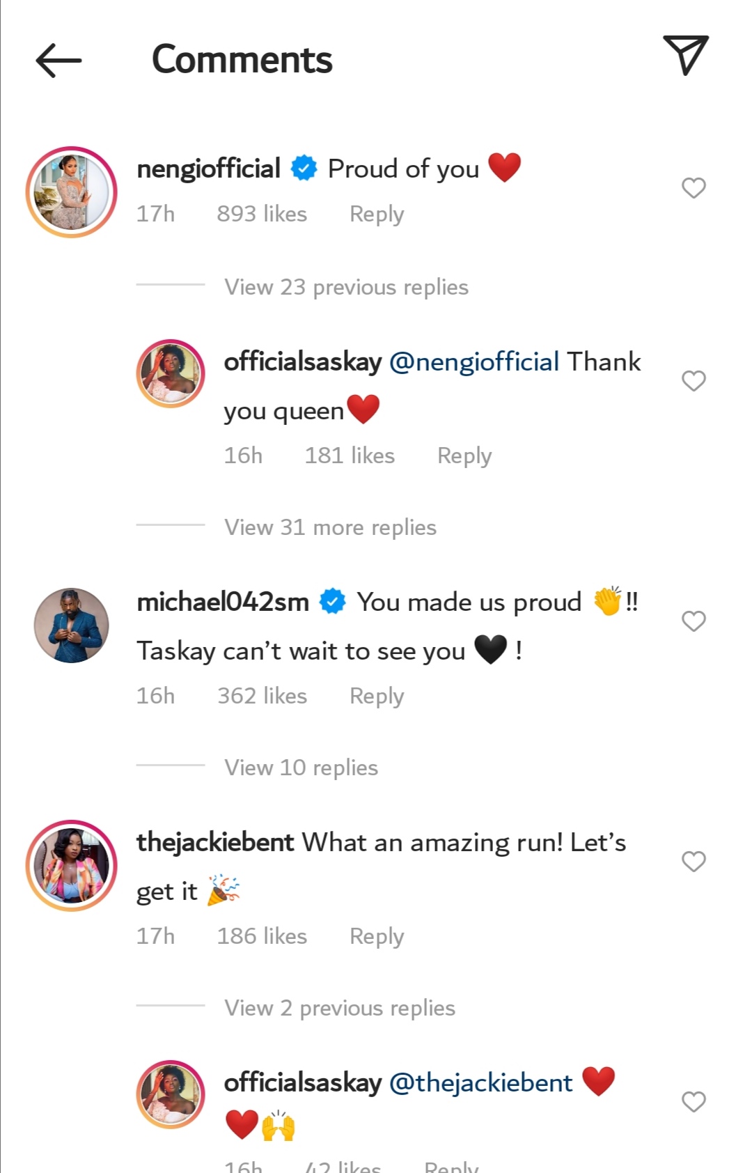 Saskay’s handler posted a video Saskay made after her eviction and many took to the comments to congratulate her including BBN ‘lock down’ star, Nengi, who shared that, she is proud of her.