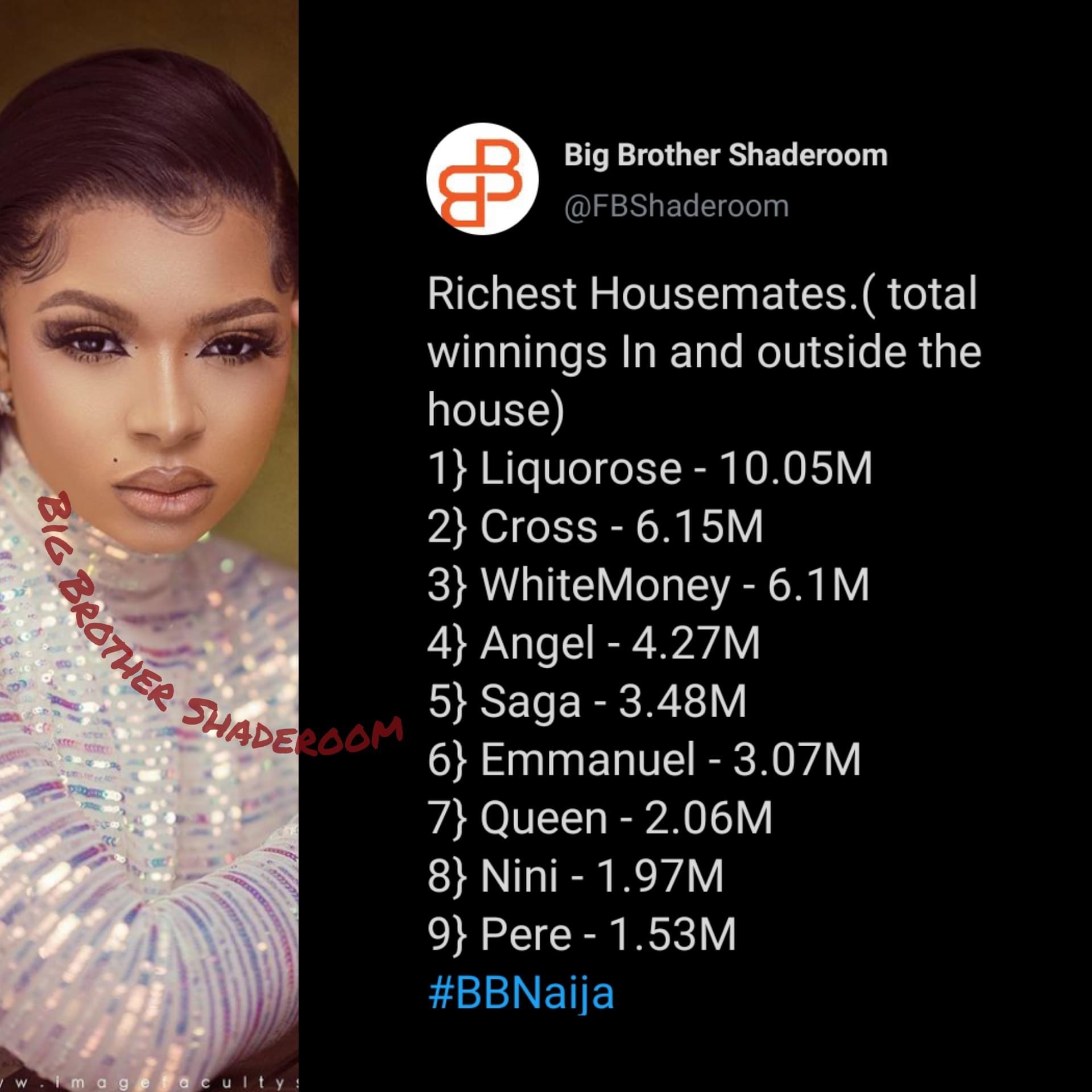Liquorose is followed by Cross who has 6.15 million naira since Saskay who had 6.9 million naira was evicted on Sunday. Whitemoney is currently the third richest housemate with 6.1 million naira followed by Angel with 4.27 million while Saga sits fifth with 3.48 million.