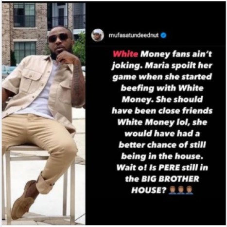 “Money fans ain’t joking. Maria spoilt her game when she started beefing with Whitemoney. She should have been close friends with Whitemoney lol, she would have had a better chance of still being in the house. Wait o! Is PERE still in the BIG BROTHER HOUSE”.