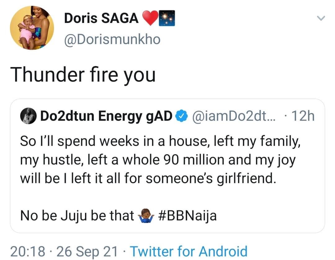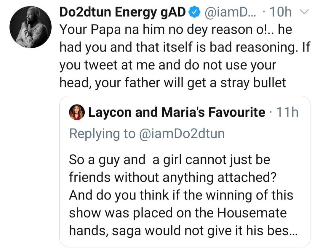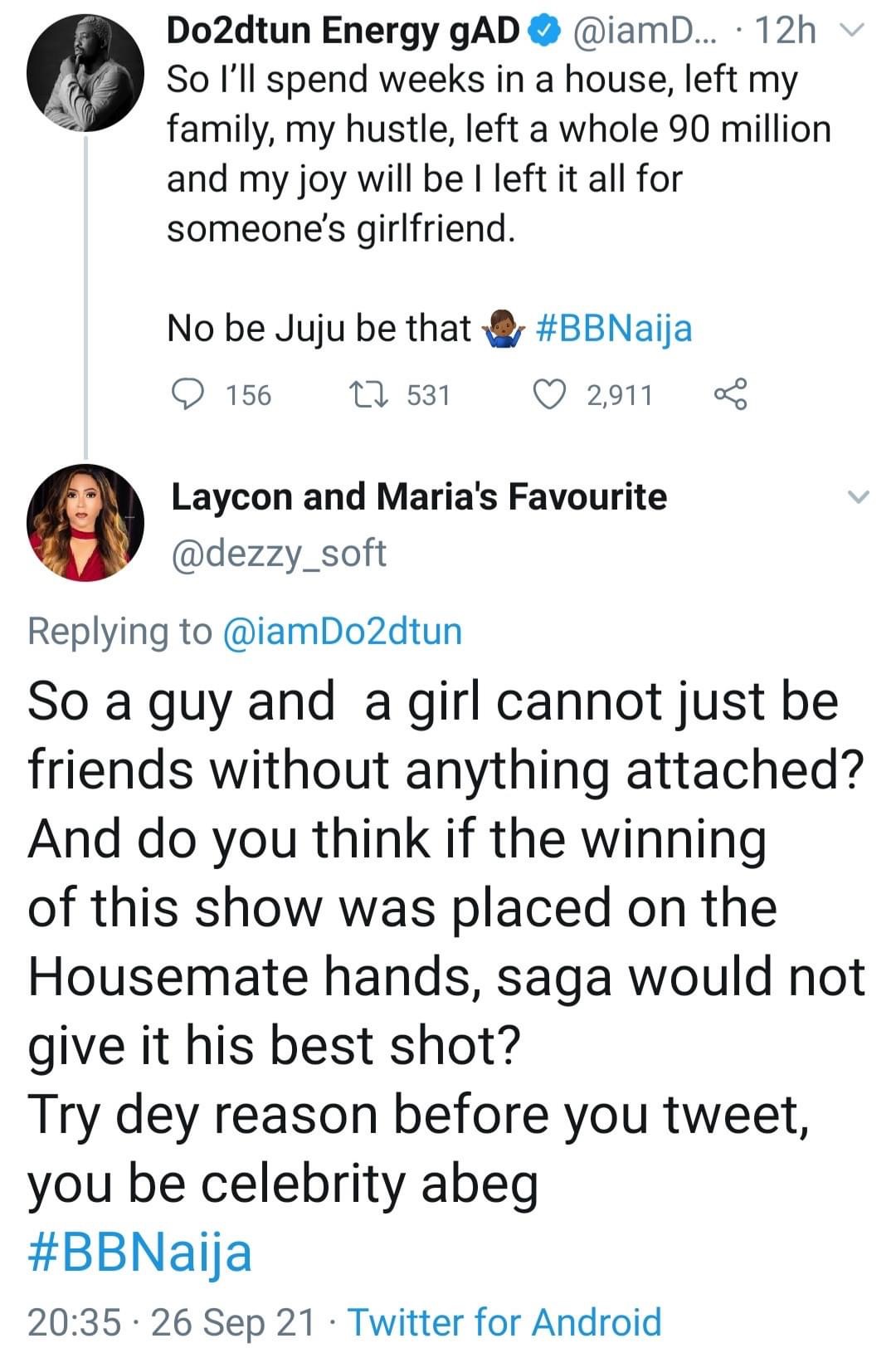 The media personality took to Twitter to comment about Big Brother Naija housemate, Saga, and his interest in a fellow housemate, Nini.