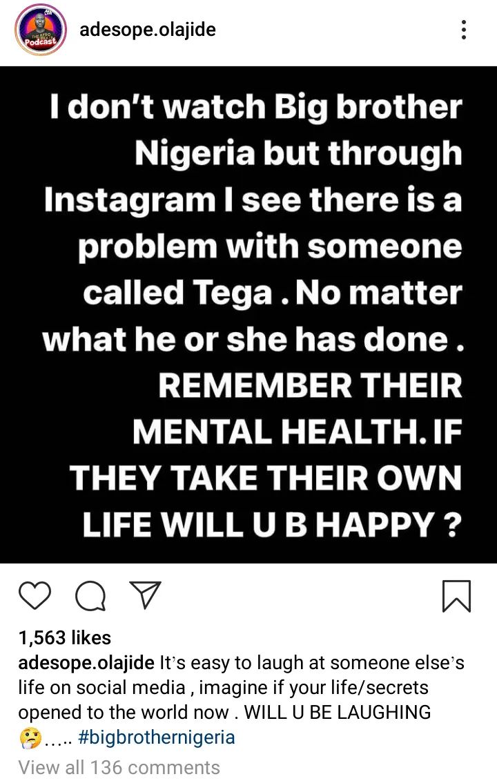“I don’t watch Big brother Nigeria but through Instagram, I see there is a problem with someone called Tega. No matter what he or she has done. REMEMBER THEIR MENTAL HEALTH. IF THEY TAKE THEIR OWN LIFE WILL U BE HAPPY?”