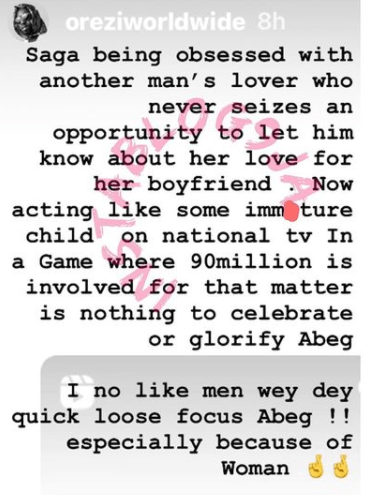 Reacting to this, he charged Saga to stop being obsessed with Nini who has never seized the opportunity to let him know about her love for her boyfriend. He described Saga attitude towards the whole situation as immature.
