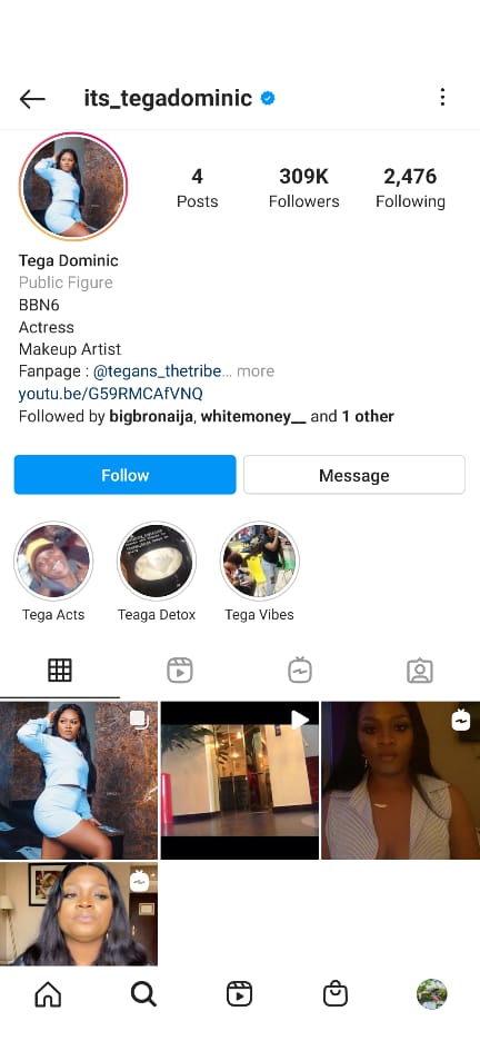 Evicted BBNaija housemate, Tega, seems to be geared up for a new beginning as she has taken down all her posts on her Instagram page including all her times in the house.