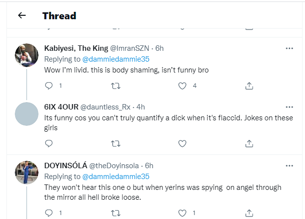 But Angel seemed to believe that, Micheal’s manhood could be small and she shared her own thoughts on the size of that of some other guys in the house, telling Jackie B that, she believes Saga has the biggest manhood in the house as she saw him in shorts the other time and she was mind blown.