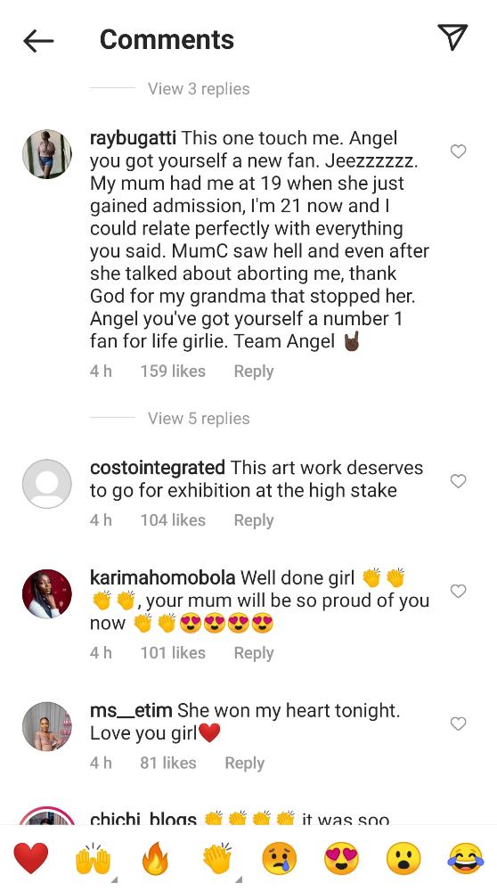 The housemates were tasked to do a presentation that depicts something unbeatable. Angel and her team used Angel’s birth story to make an art story. The story behind the act got a lot of fans teary.