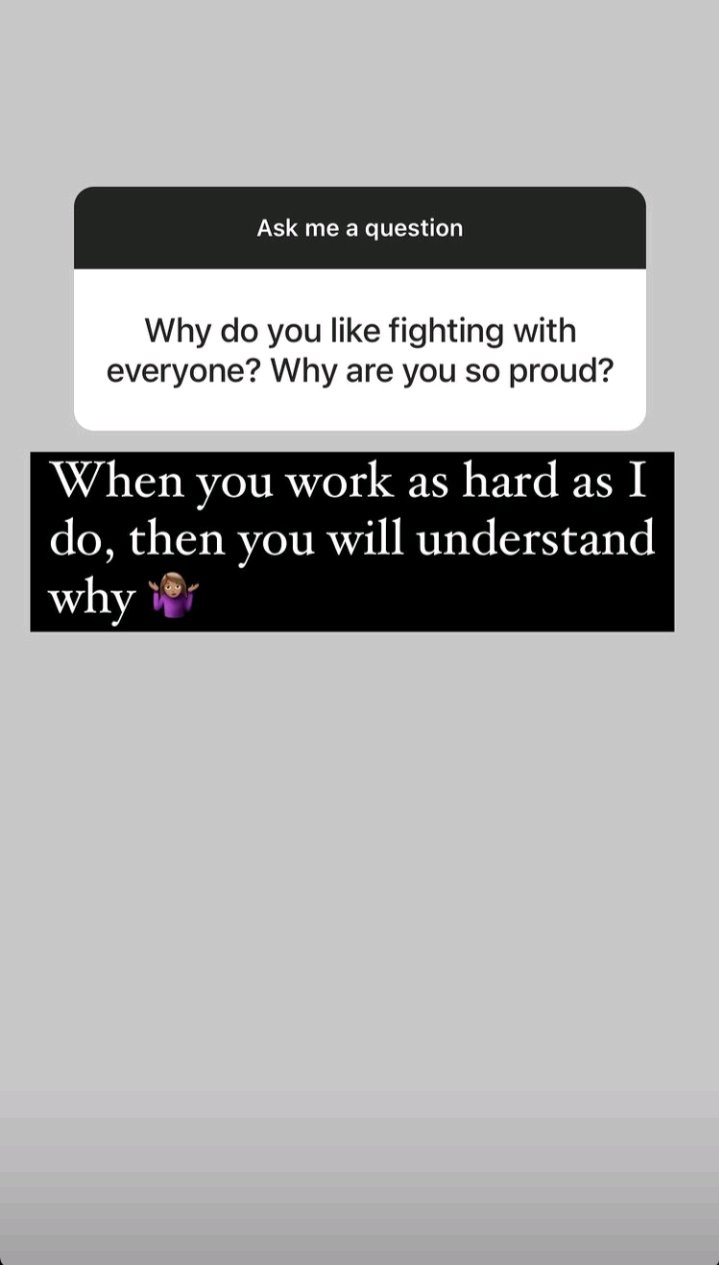 In a questions and answers session with her fans, she has divulged her reasons for always fighting others and being proud. According to her, her fans would understand her when they begin to work harder as she does for a living.