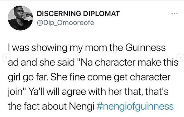 Well, according to Dip Omooreofe, he showed the Guinness advert to his mum and his mum stated that Nengi is hitting major milestones in her life now because of her good character.