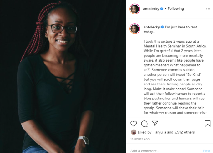In a lengthy post, she expressed displeasure about how people have gotten meaner. She spoke about how people do not care about the psychological problems of others. She cited some examples using her experiences on social media. To her, people supported her after she disclosed an emotional trauma she was going through. According to Lecky, they thought she had nothing. Hence, the pity to donate money to help her in her situation.
