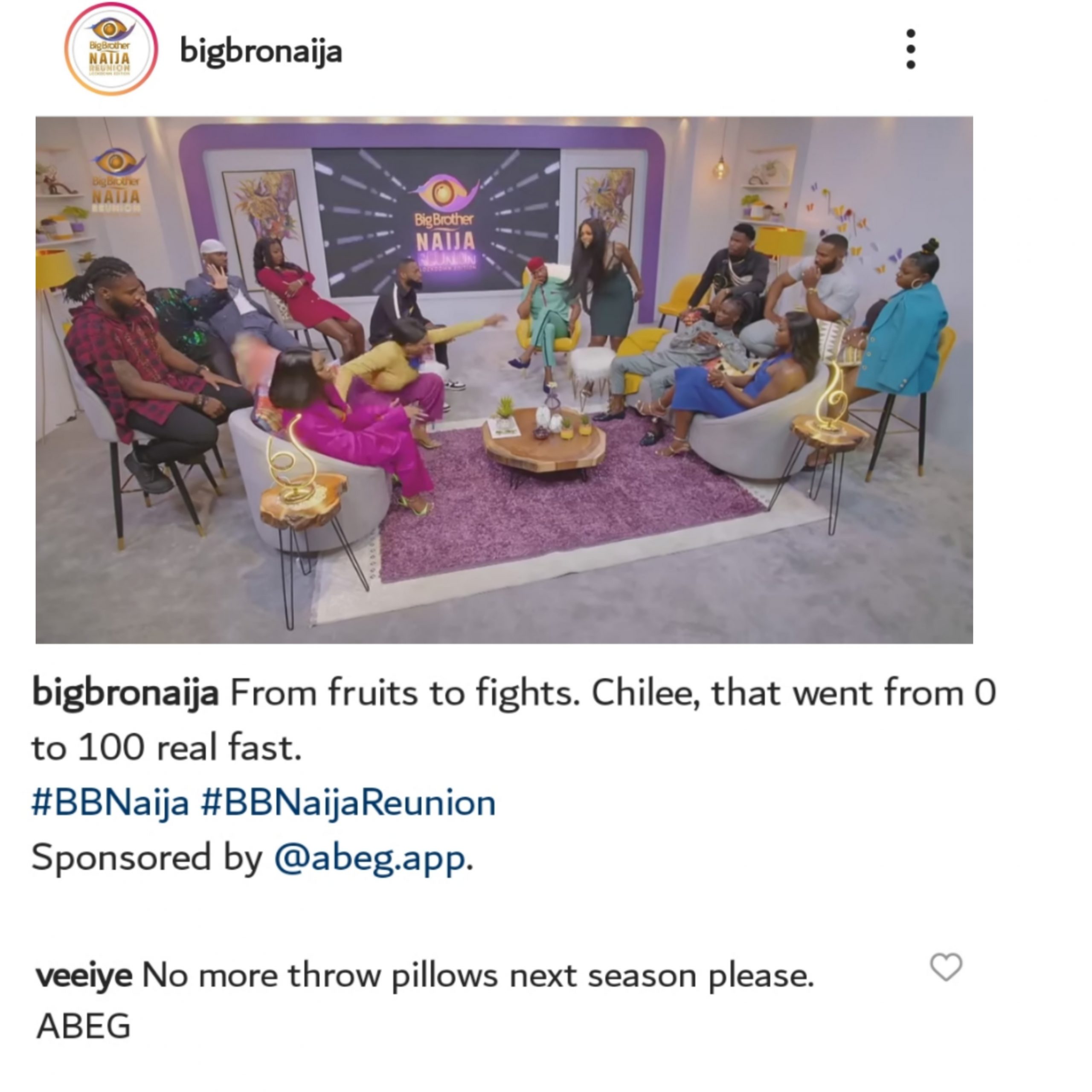 Vee, who was the first to have received a pillow to the face during her argument with Tolanibaj, seem to have been tired of the ‘pillow violence’ and has therefore pleaded with big brother that, “no more throw pillows next season.”