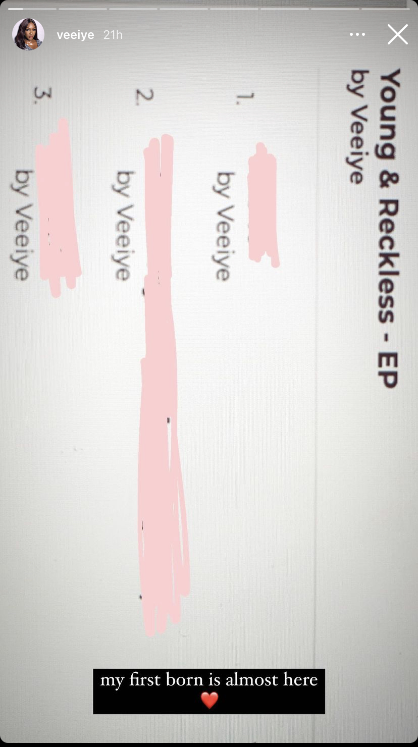 Big Brother Naija Season 5 star, Vee, who doubles as a musician, has hinted on releasing an Extend Playlist (EP) soon dubbed, ‘Young & Reckless.’ Vee who was part of the BBNaija ‘Lockdown’ edition finalist took to her Instagram page to make this announcement. Per what she showed, only two tracks which names were covered showed on the list.