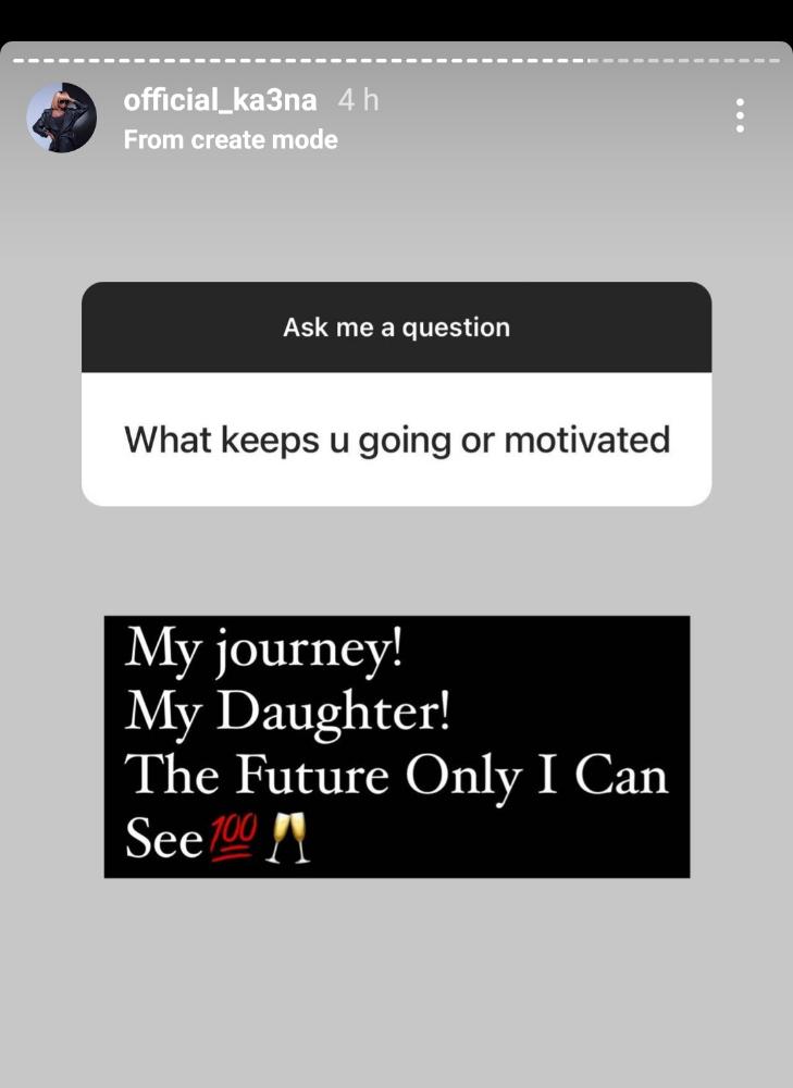 Ka3na made this known during a question and answer session with her fans where a fan asked, “What keeps u going or motivated”. She answered by saying, “My journey! My Daughter!, The future only I can see”.