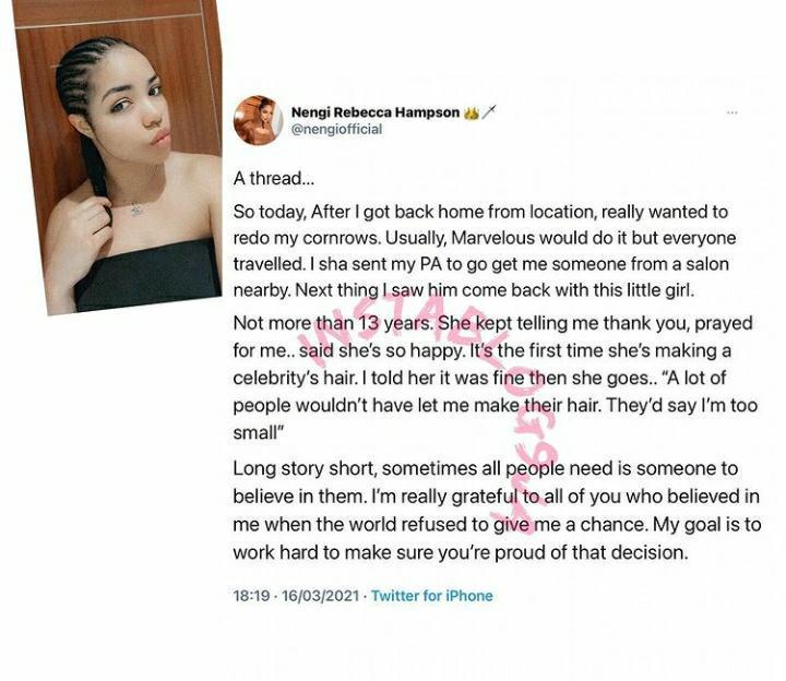 Nengi stated that the new stylist was just a 13-year-old girl, who kept thanking her for allowing her to braid her hair as Nengi was the first celebrity she rendered her service to.
