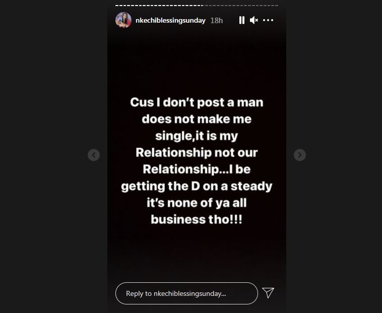 Nkechi Blessing Sunday has taken to social media and noted that she won’t be forced to flaunt her partner on social media as many of her fans keeps asking about her man since Valentine is approaching.