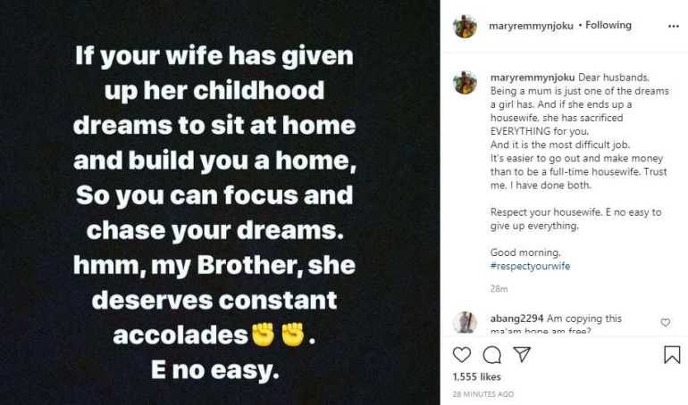 Mary Njoku has taken to social media to advocate for girls that become full house wife just to build their home and secure it.