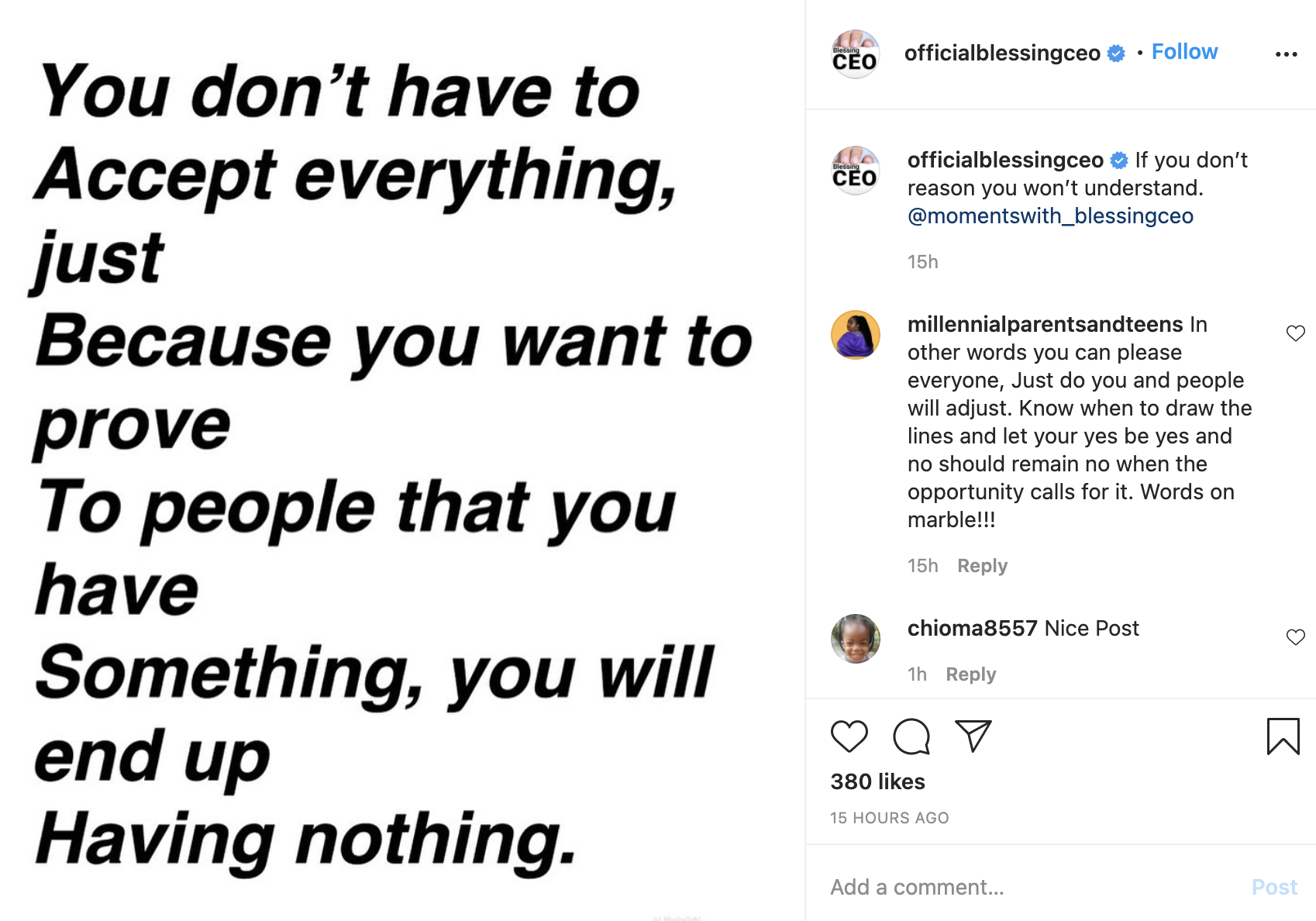 Blessing Okoro has taken to social media to advise people who always want to prove they have something by saying they don’t have to accept anything, just because they want to prove to people that they have something.