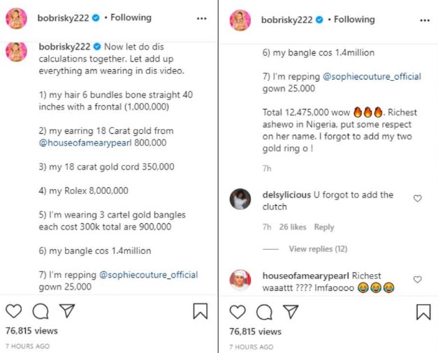 Nigerian controversial crossdresser, Bobrisky, has challenged her colleagues to speed up their game as she flaunts the jewellery she wore to date as the richest ashewo’.