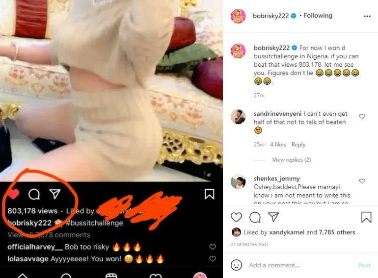 Bobrisky also joined the challenge and so far she has been the one with the highest view on the gram. Considering this, he has crowned himself the winner of the competition daring any challenger to bring out his or her views for a challenge.
