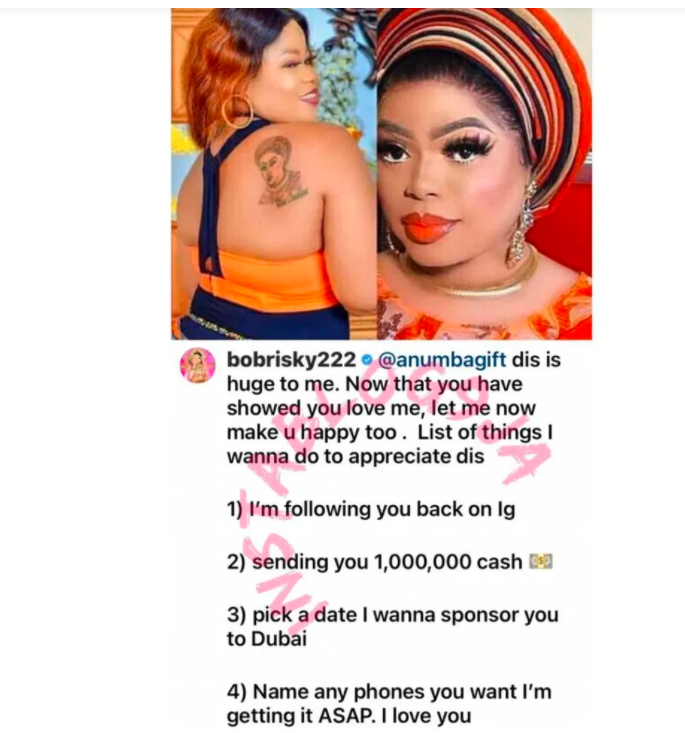 Nigerian crossdresser, Bobrisky, has been overwhelmed by the love shown to her by one of her fans who has tattooed her face at her back.