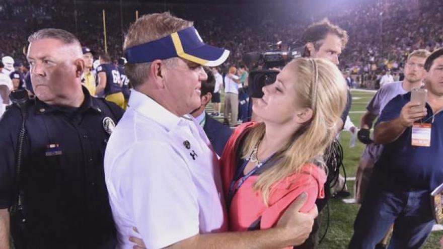 Grace Kelly is the daughter of the famous Brian Kelly. Grace Kelly is just like the other 80,000 fans at Notre Dame Stadium, she bleeds blue and gold. Unlike other fans, her blood also sets her apart. Grace has grown up on the sidelines with her dad and it has made her more than just a fan.