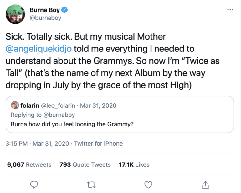 “Sick, Totally sick. But my musical mother @angeliquekidjo told me everything I need to understand about the Grammys. So now I’m “Twice As Tall”(that’s the name of my next album, by the way, dropping in July by the grace of the Most High)”.