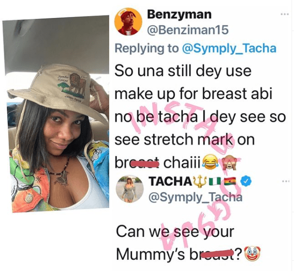 Reacting to this, Tacha responded to the fan and said, “Can we see your mummy’s breast”.