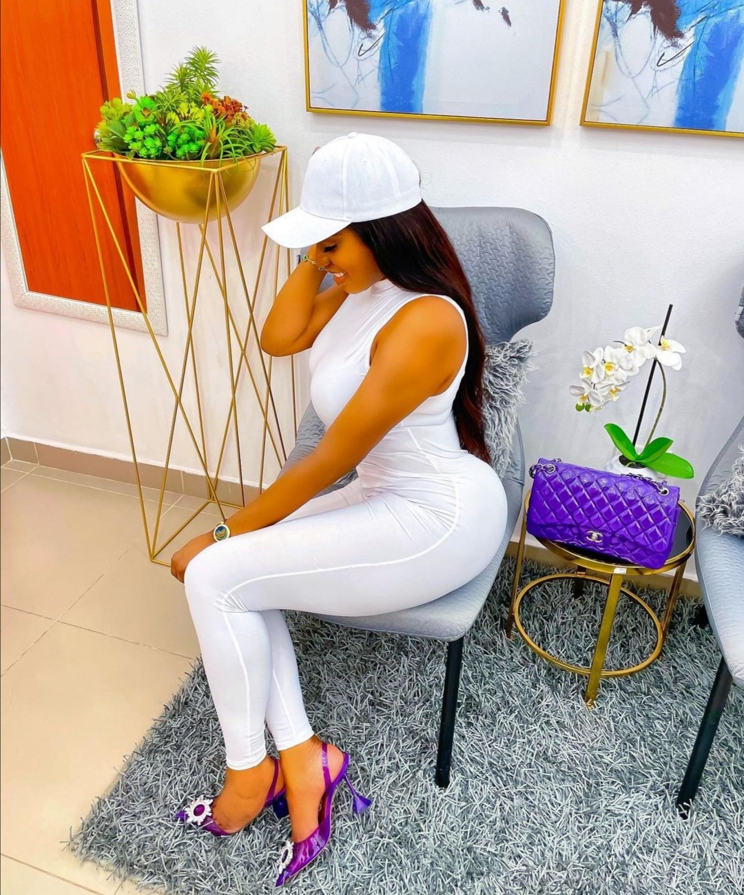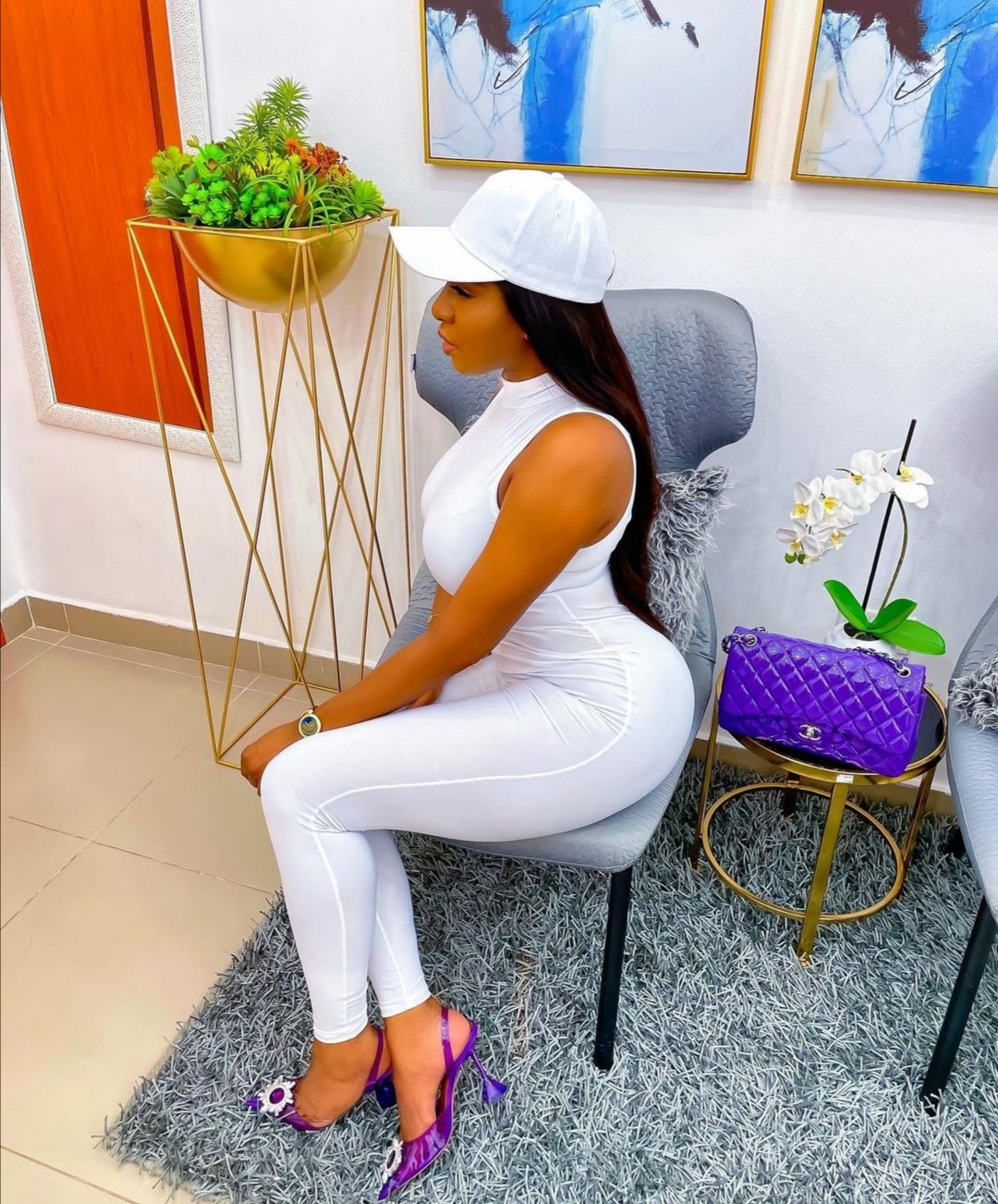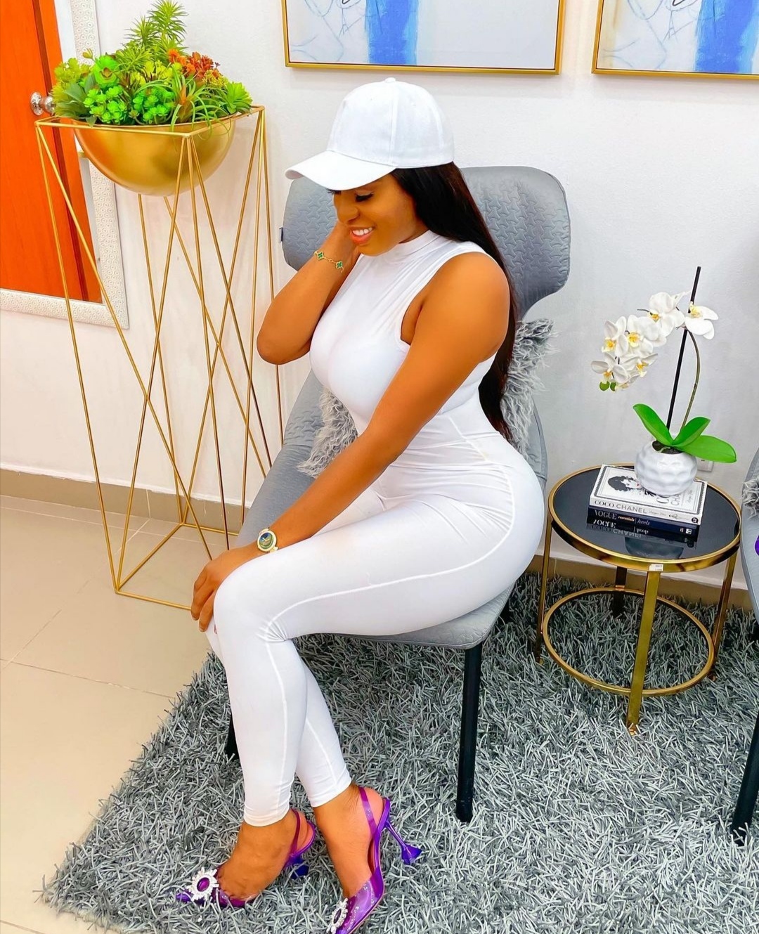 The actress, hit Instagram with some finesse, as she looked classy and gorgeous in a white sleeveless bodycon jumpsuit, matched with a white cap and a pair of mauve-colored plain heels.
