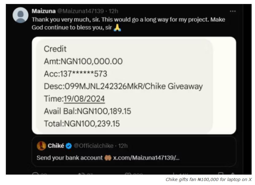 • The fan, who had been tagging Chike for six days seeking a laptop to aid his project, received the funds after Chike requested his bank details.