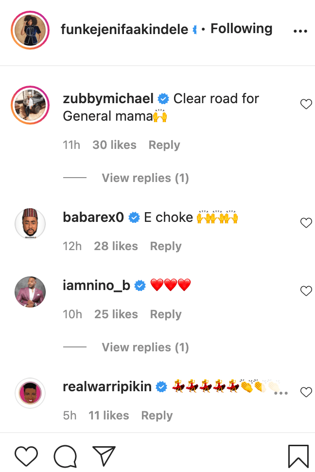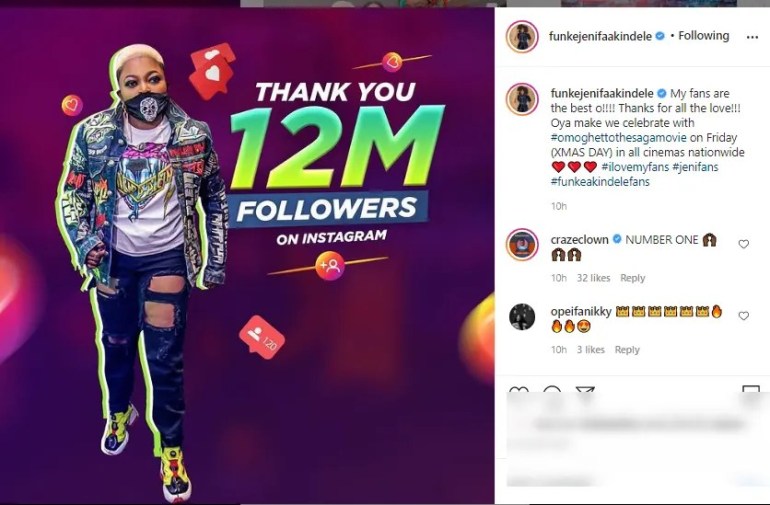 Zubby Michael and other celebrities have reacted as Funke Akindele reached a whopping 12 million followers on Instagram, becoming the most followed Nollywood actress on the photo and video sharing platform.
