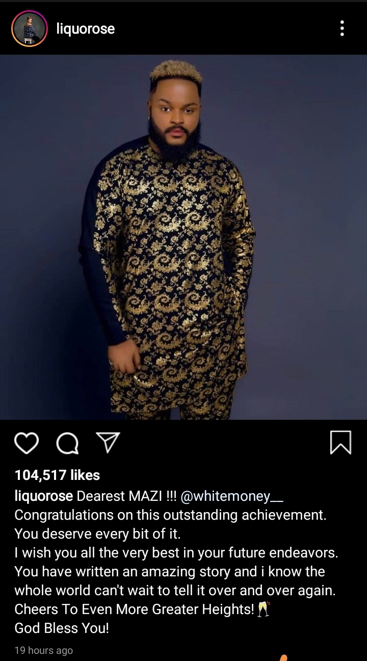 According to Liquorose, Whitemoney deserves the winner and she wishes him well in all his endeavors. She stresses that this victory is just the beginning of greatness to be witnessed by Whitemoney.