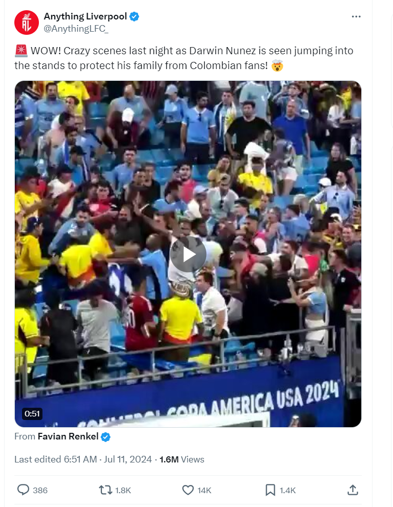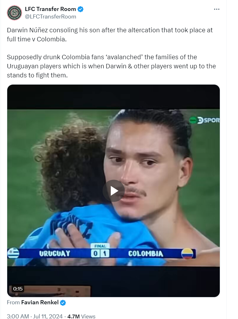 Nunez was very upset after the game. He was seen climbing over railings and going into the crowd to confront some Colombia fans. Other people tried to hold him back.