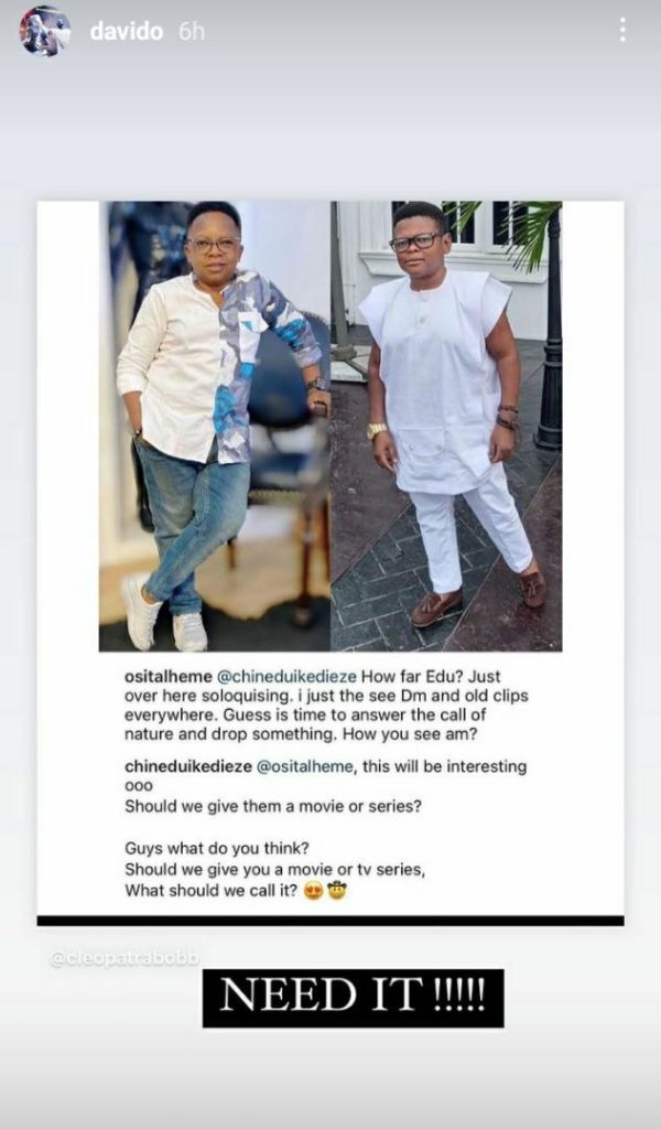 Nigerian singer, Davido, has reacted as veteran actors Aki and Pawpaw have hinted at plans to return to the screens with a movie series.