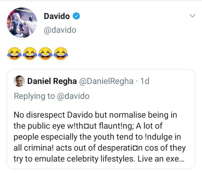 American born Nigerian singer, Davido, has reacted after Twitter user, Daniel Regha advised him to stop showing off and inspire people with his way of life.